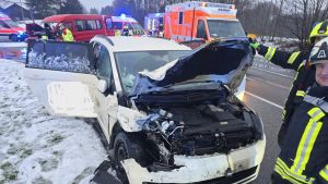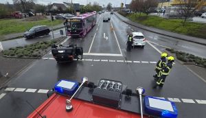 Ein Pkw hatte sich überschlagen und kollidierte mit einem Bus. Die zwei Insassen des Pkw wurden leicht verletzt und vom Rettungsdienst versorgt. Niemand war eingeklemmt. Die Löschzüge 2 bis 4 konnten auf der Anfahrt bereits ihren Einsatz abbrechen. Die Einsatzkräfte der Feuerwehr unterstützten die Beamten der Polizei. Für die Dauer der Arbeiten blieb die Kreuzung gesperrt.